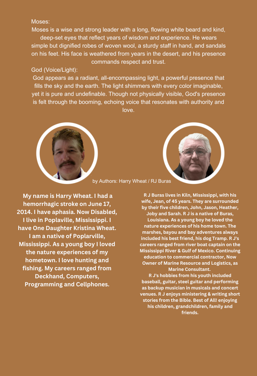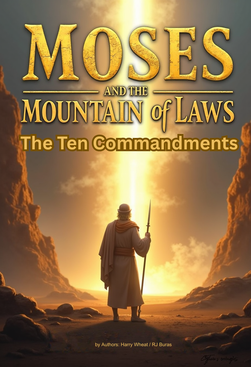 Moses and the Mountain of Law: The Ten Commandments: Moses is a wise and strong leader with a long, flowing white beard and kind, deep-set eyes that reflect years of wisdom and experience. He wears simple but dignified robes of woven wool, a sturdy staff in hand, and sandals on his feet. His face is weathered from years in the desert, and his presence commands respect and trust.